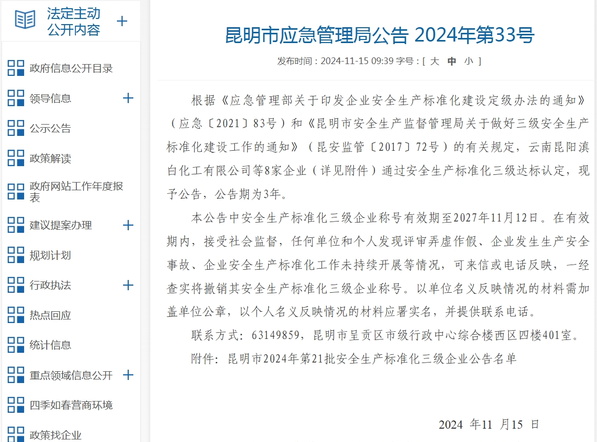 11月15日,昆明市應(yīng)急管理局印發(fā)公告,公布昆明市2024年第21批安全生產(chǎn)標(biāo)準(zhǔn)化三級(jí)企業(yè)公告名單,8家企業(yè)榜上有名。其中,國(guó)藥集團(tuán)昆明血液制品有限公司(以下簡(jiǎn)稱“昆明血制”)順利獲評(píng)“醫(yī)藥行業(yè)安全生產(chǎn)標(biāo)準(zhǔn)化三級(jí)企業(yè)”。